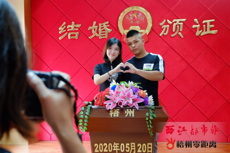 5月20日,在萬秀區婚姻登記處,一對新人在完成登記后合影留念。西江都市報記者 何鎏 攝