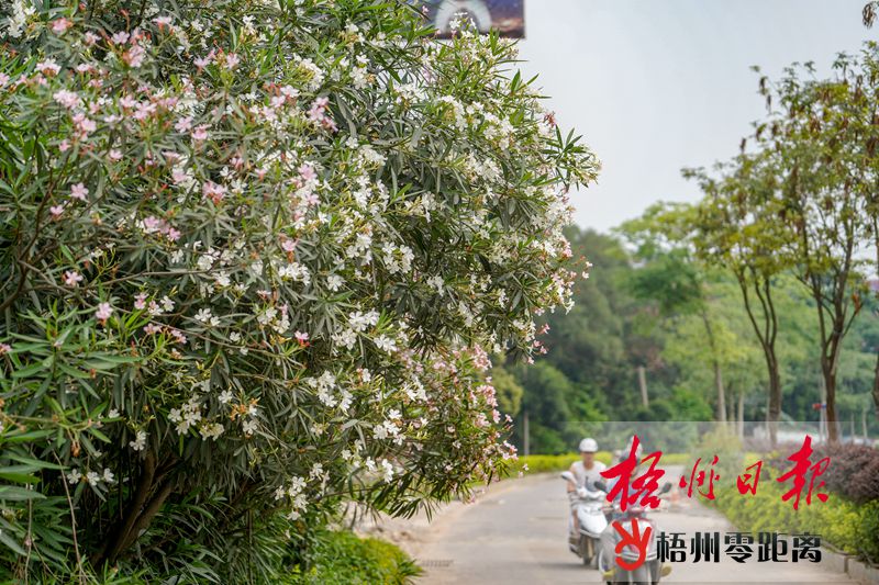 近期,道路沿線的夾竹桃迎來花期,與仍在開放的寶巾花一同為城區增色。