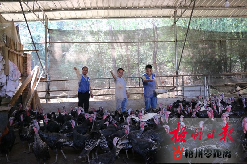 5月13日,蒼梧縣京南鎮高穩村第一書記吳金孔(右)和駐村工作隊員麥稚平(左)幫助群眾程北全(中)喂養火雞。廖偉 攝