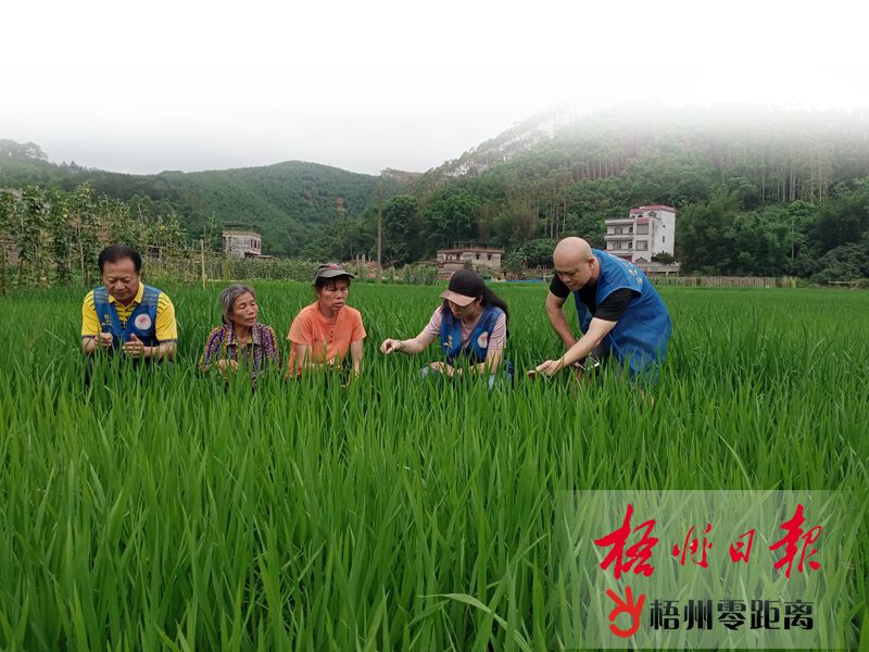 5月11日,龍圩區龍圩鎮新利村駐村工作隊員到田間察看貧困戶鐘世全(左三)種植的富硒水稻長勢。李燕華 攝 |