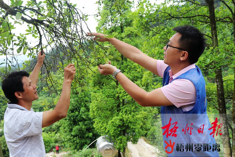 5月12日,在岑溪市安平鎮三塘村,駐村第一書記孔祥乾(右)幫助貧困戶采摘八角。吳家寧 攝