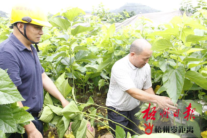 5月11日,蒙山縣西河鎮古排村駐村扶貧工作隊員陸金信(左)來到貧困戶李文武的桑園,深入了解他發展種桑養蠶的情況,幫助他解決實際問題。江永錄 攝