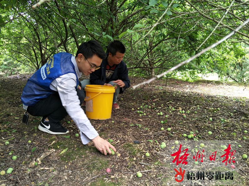 4月28日,藤縣古龍鎮大村村駐村工作隊員蔣晉煒(左)幫助貧困戶盧健宗摘三華李。 (圖片由蔣晉煒提供)