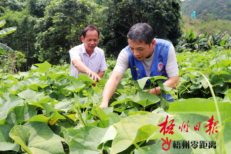 4月29日,蒼梧縣嶺腳鎮康寧村駐村工作隊員宋武生(左)深入田間地頭,和貧困戶拉家常、聊發展,及時協調解決產業發展難題。李榜 攝