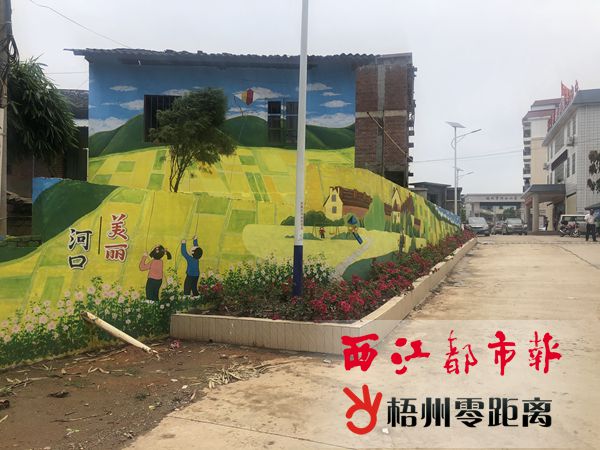 梧州零距離網(wǎng)-西江都市報訊(記者 謝韻 通訊員 黎海平)整潔寬敞的村道、展示農(nóng)村風(fēng)貌的壁畫……進(jìn)入萬秀區(qū)城東鎮(zhèn)河口村,映入眼簾的是環(huán)境舒適的村容村貌。據(jù)悉,為了將河口村打造成為城東鎮(zhèn)鄉(xiāng)村振興示范點(diǎn),今年春節(jié)過后,該村持續(xù)開展“三清三拆”工作,并對村容村貌進(jìn)行亮化、綠化、美化。 5月22日,記者乘車來到河口村。在位于蓮花大橋附近的河口村入口處,樓房外墻上一幅“美麗河口歡迎您”的圖畫,吸引了路人的目光。畫中,兩個帶著草帽的小孩為前來河口村的游客做指引。順著小孩手指的方向,便可看到一條進(jìn)入河口村的村道。村道寬敞整潔,兩旁還栽種了寶巾花,裝上了太陽能路燈。而河口村村委辦公大樓入口處的房屋和圍墻,則被彩色的田園畫卷所覆蓋。畫卷里,藍(lán)天白云、青山、稻田、休憩的人們,展現(xiàn)了一幅宜居鄉(xiāng)村的畫面。
