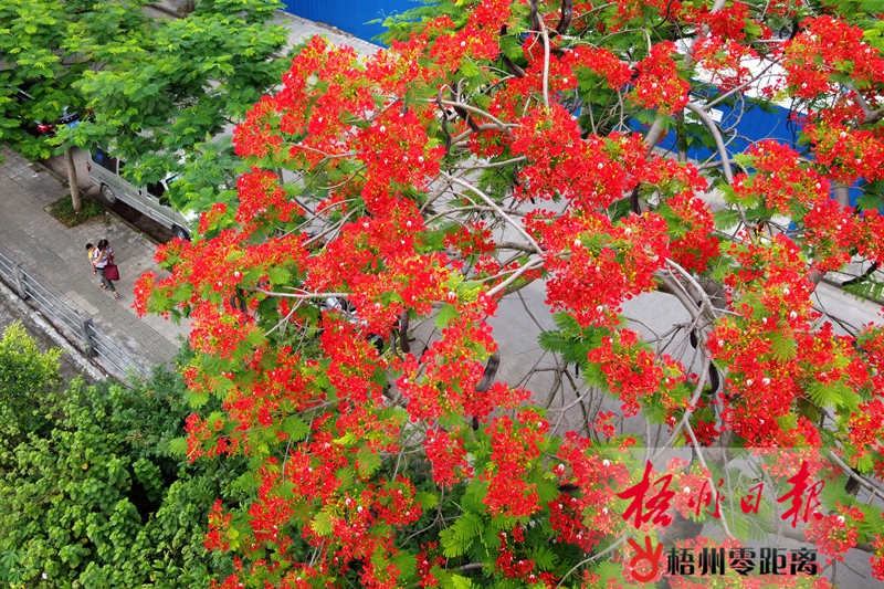 5月25日,市民在火紅花朵盛開的鳳凰木下走過。近段時間,鴛江路上幾棵高大的鳳凰木陸續(xù)盛開,滿樹紅色的花朵甚為驚艷,為炎炎夏日中的市區(qū)增色不少。