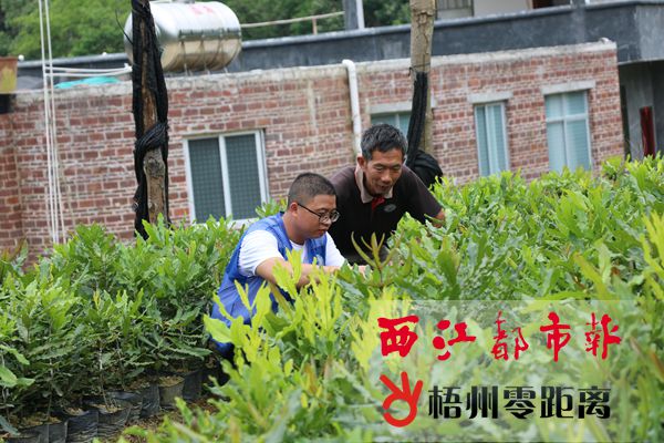 “這個(gè)堅(jiān)果苗品種是‘桂熱一號’,產(chǎn)量高,種植五年的樹單棵掛果可達(dá)50公斤,也容易管理,建議你們種這個(gè)。”近日,在蒼梧縣京南鎮(zhèn)的圩市上,寺垌村脫貧戶黃漢培熱心地為種植戶講解自家嫁接的澳洲堅(jiān)果苗。在展示自家苗木的同時(shí),他也積極邀請種植戶到自己位于寺垌村的澳洲堅(jiān)果種植場參觀。 2015年,黃漢培家庭被認(rèn)定為貧困戶。家中,母親和妻子均患病,缺乏勞動(dòng)力,8歲的孩子還在讀小學(xué),全部的重?fù)?dān)壓在52歲的黃漢培一人的肩上。然而,黃漢培并沒有向命運(yùn)屈服。考慮到寺垌村當(dāng)?shù)氐沫h(huán)境,他在朋友的介紹下引種澳洲堅(jiān)果。 種植初期,由于缺乏經(jīng)驗(yàn)且種植規(guī)模小,澳洲堅(jiān)果的產(chǎn)值很低,黃漢培曾一籌莫展。2017年,在京南鎮(zhèn)寺垌村駐村第一書記梁福年的幫扶下,黃漢培又重樹信心。梁福年幫黃漢培制訂了有針對性的脫貧方案,并到岑溪市的澳洲堅(jiān)果種植場考察學(xué)習(xí),幫他帶回來澳洲堅(jiān)果新品種和種植技術(shù)。