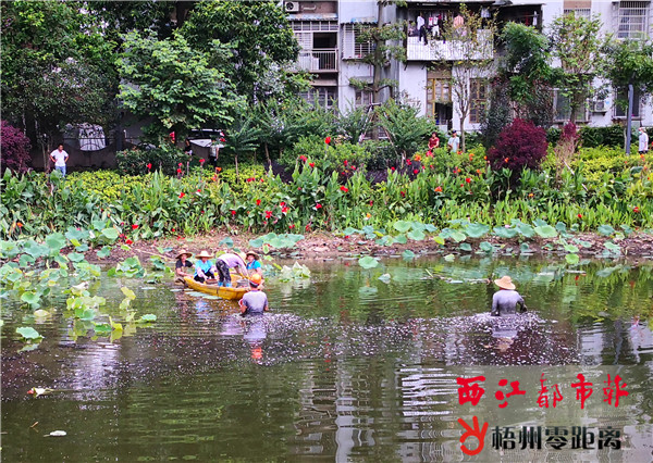 5月26日上午,在萬秀區(qū)潘塘公園荷花塘內(nèi)看到,幾名工人站在水中和在船上的工人配合著栽種荷花,美化景觀提升后的潘塘公園。李應(yīng)良 攝