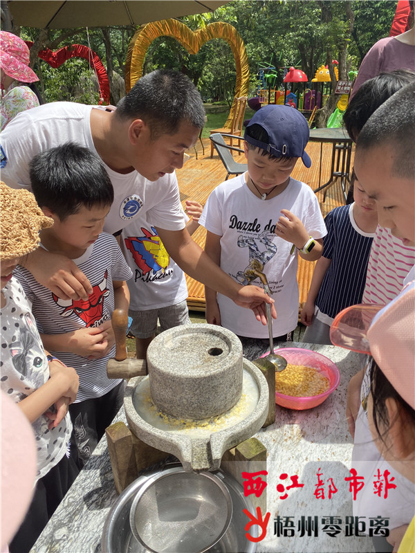 當天上午9時,覃彥鈞和其他小記者,以及部分小記者的親友一起,坐上了開往岑溪四星級鄉村旅游區——鳳語莊園的大巴車。當天,他們將參加梧州日報社在莊園里組織的“童趣鳳語”親子研學活動。 為迎接“六一”國際兒童節,助力鄉村旅游發展,梧州日報社組織了本次“童趣鳳語”親子研學活動,讓參與活動的孩子及其親友在專業拓展教練的指導下,體驗一系列趣味十足的鄉村文化活動。 剛到達目的地,小記者們就被一排小石磨吸引住了,原來,一場手工研磨豆漿的體驗已經在等著他們了。在專業拓展教練的安排下,小記者們分成了若干個小組,并以團體競賽的形式進行比拼。 “不就是磨個豆漿嘛,有啥難的,我來!”小記者韋幸言上前一把握住石磨的木柄,不斷地旋轉起來??墒牵f幸言磨了很久都沒見到豆漿的蹤影。此時,一旁的教練指出了問題:“你放黃豆太多了,豆和水的比例為一比三才適中。”按照教練的指導,韋幸言調整了豆和水的比例,成效立刻展現。韋幸言不禁感慨地說:“沒想到,做一小杯豆漿居然還要有學問?!?/p>
