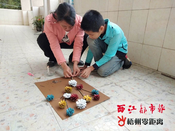 梧州零距離網-西江都市報訊(記者 紀榮蘭 通訊員 蘇夢椿 黃培平) 用松樹皮、松樹葉、松果拼湊生動形象的“松韻”手工作品,校道旁《悠悠茶鄉、育人無痕》的大型壁畫,45米長的新三字經德禮文化宣傳欄、700多盆花草組成的生態墻……這些都是蒼梧縣中小學校創建“一校一品”特色校園文化的成果。