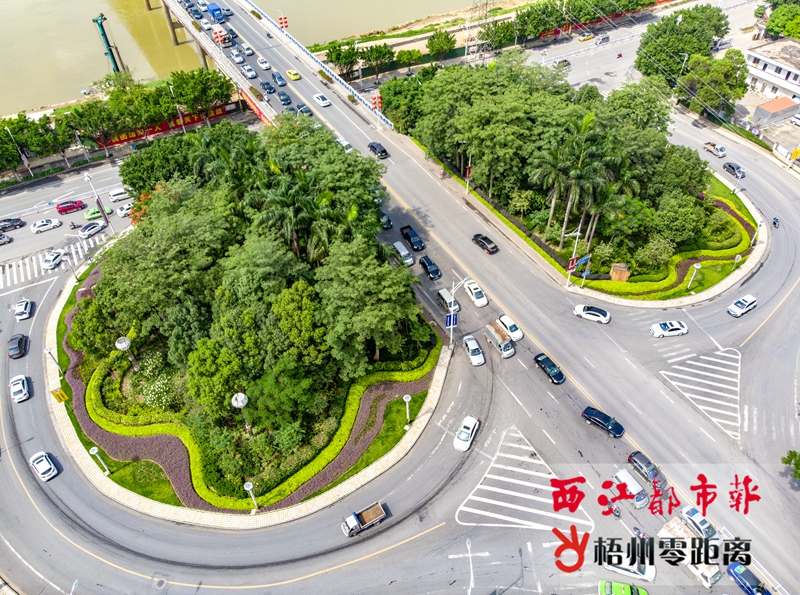 6月2日,盛放的千日紅和菊花為西江大橋汊河橋北橋頭披上多彩的外衣,俯瞰之下整個綠化帶如花瓣形狀。