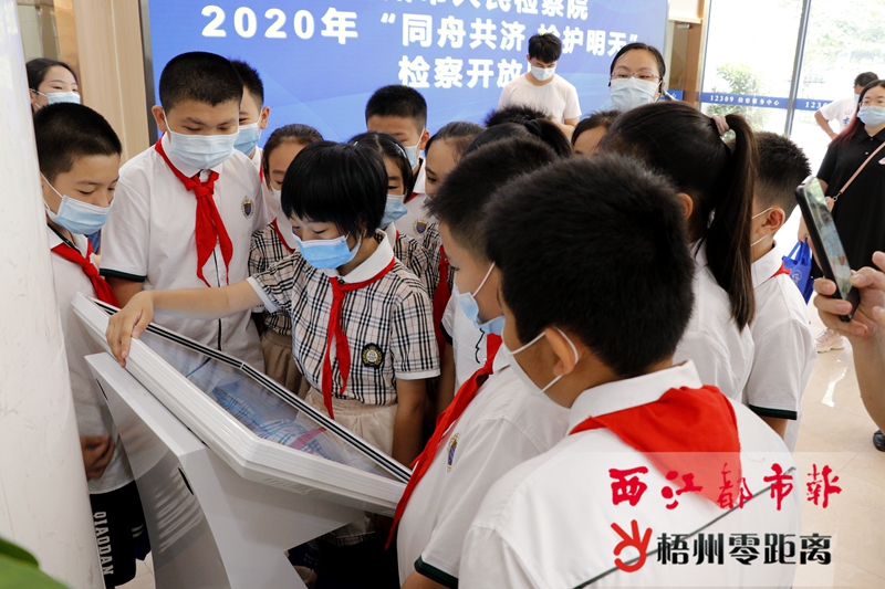 5月29日上午,梧州市人民檢察院開展“檢察開放日”活動,邀請市民代表走進(jìn)檢察機(jī)關(guān),了解檢察工作。圖為學(xué)生們在12309檢察服務(wù)中心體驗機(jī)器查詢功能。梁綺 攝