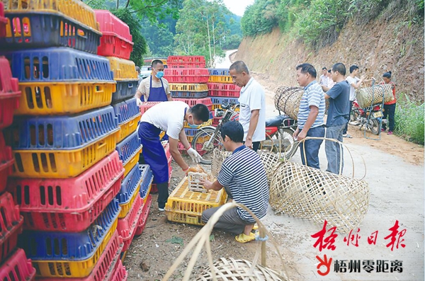 梧州零距離網-梧州日報訊 6月8日清晨,在藤縣埌南鎮黎寨村蝴蝶谷臨時雞苗發放點,一早趕來的建檔立卡貧困戶盧錦華領到剛發放的30羽雞苗后發出爽朗的笑聲。在熱鬧的雞苗發放現場,建檔立卡貧困戶與熱情的村民幫助工作人員搬運雞苗。駐村工作隊員、技術人員和村兩委干部有序地給貧困戶發放雞苗、講解飼養雞苗注意事項及疫病防治知識。
