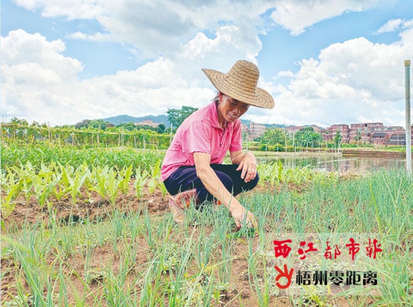 梧州日報記者 蒙敏瑩 通訊員 莫思銘 洪蘊 六月的中午,驕陽似火,在長洲區長洲鎮長地村,盛開的荷花與藍天白云相互映襯,為盛夏增添了迷人的色彩。此時,剛剛從市場賣菜回到家的莫金英,又穿上雨靴、戴上草帽,來到荷塘邊上自家的菜地里忙活。
