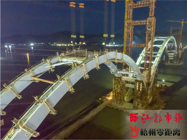梧州零距離網-西江都市報訊(記者 吳艷虹 通訊員 王衛平)6月22日零時,隨著西江四橋北岸邊跨鋼拱肋最后一個鋼箱結構吊裝,西江四橋全橋鋼拱肋合龍順利完成。這也標志著該橋完成第二次受力轉換,西江四橋建設取得了又一個階段性勝利。