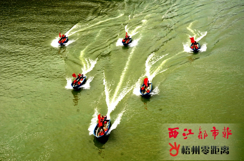 水上演練環節,沖鋒舟在進行編隊航行。(記者 楊揚 攝) 而在隨后的沖鋒舟編隊航行環節中,軍地聯合抗洪搶險救援分隊按照不同隊形在江面上航行。據現場指揮員李瀚明介紹,梧州汛期時間長、強度大,在演練中安排沖鋒舟編隊航行環節,可進一步檢驗指揮員指揮、操作手操縱旗語,以及各沖鋒舟之間的協同作戰能力,有助于開展水中大規模應急救援。 |