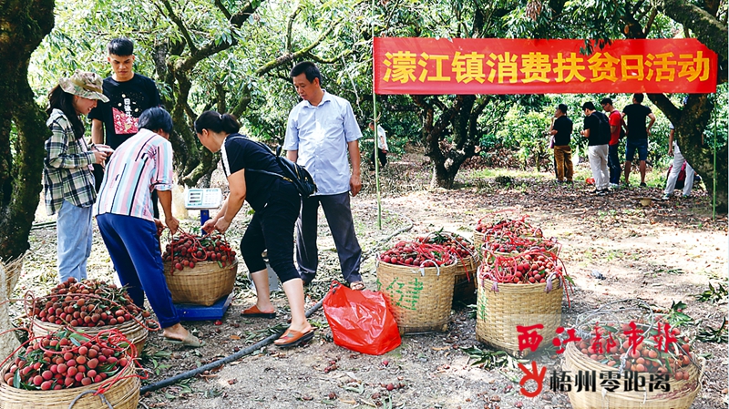6月23日,在藤縣濛江鎮健良村荔枝產業扶貧示范基地舉行的消費扶貧日活動中,當地貧困戶正在各自種植的果園里現場采摘荔枝,全鎮干部職工則采用“以購代扶”方式認購貧困戶的農產品,為貧困戶架起消費扶貧供需對接的橋梁。據悉,活動當天,該鎮干部職工共計采購了1500多公斤荔枝。 (黃文麗 攝)