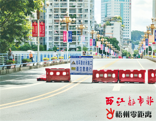 6月27日,因萬秀區南環路展開路面提升施工,桂江一橋東橋頭至大學路文瀾路交界路口行車道暫時封閉,但行人在上述路段仍可正常通行。記者 陳凡 攝