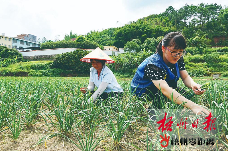 6月23日,在岑溪市馬路鎮(zhèn)五星村,駐村第一書(shū)記黃富英(右)幫助村民采收韭菜花。吳家寧 攝 |