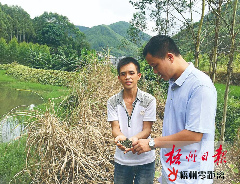 6月26日,龍圩區(qū)龍圩鎮(zhèn)寨中村駐村第一書(shū)記黃劍鋒(右)到貧困戶(hù)陳慶建的水塘了解田螺的生長(zhǎng)情況。 李煥坤 攝