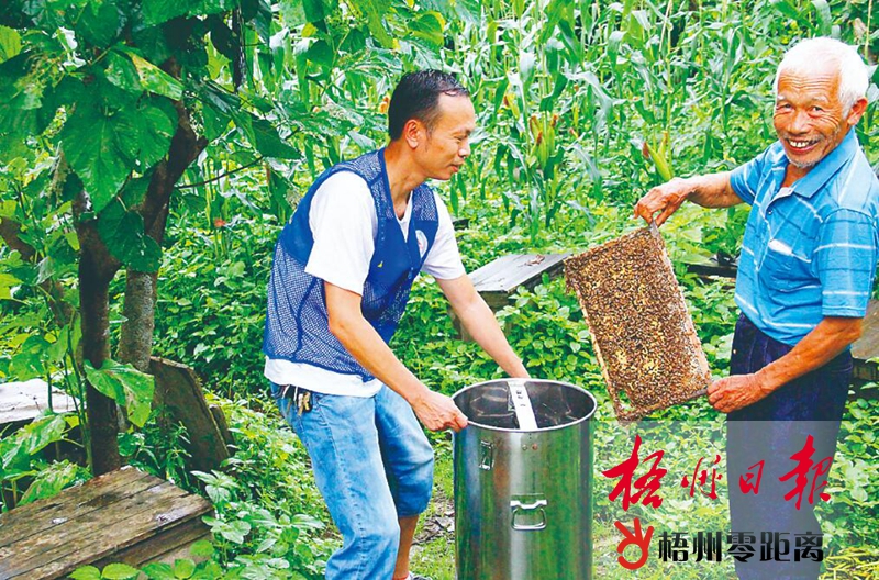 6月18日,蒙山縣西河鎮(zhèn)樂(lè)擁村駐村第一書(shū)記廖霖(左)配合貧困戶(hù)周培全機(jī)抽蜜糖。今年,西河鎮(zhèn)樂(lè)擁村榕木二組貧困戶(hù)周培全在廖霖的幫扶下,養(yǎng)殖蜜蜂150多群,共產(chǎn)蜜500多公斤。 江永錄 攝