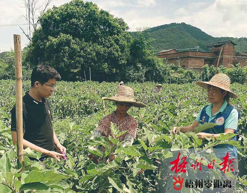 6月22日,蒼梧縣石橋鎮(zhèn)奇沖村駐村第一書(shū)記曾劍冰(右)指導(dǎo)群眾嚴(yán)少蓮種植茄子。 周佐沅 攝