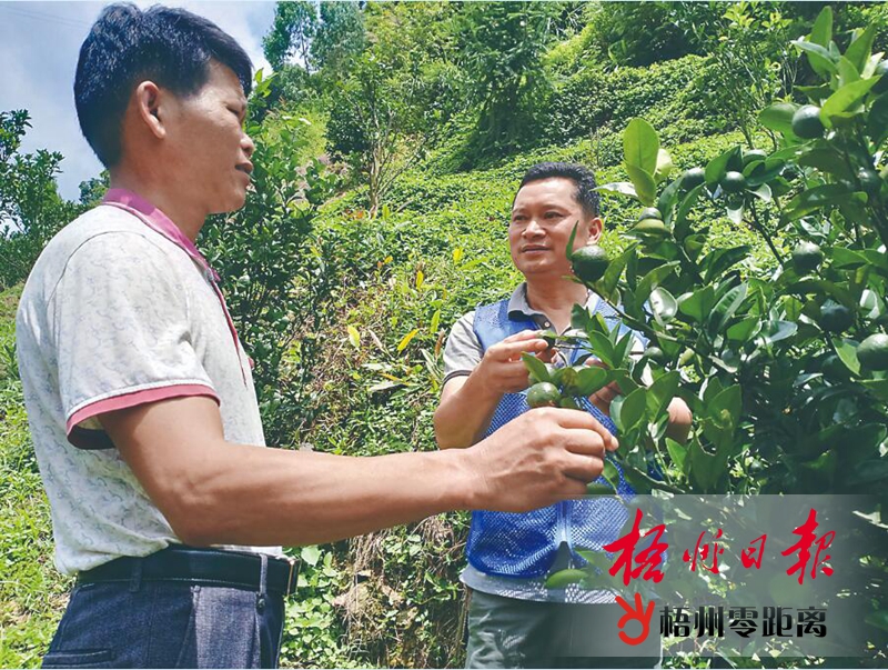 6月17日,蒼梧縣京南鎮(zhèn)富寧村駐村第一書(shū)記黎國(guó)華(右)指導(dǎo)貧困戶(hù)黎炳坤種植砂糖橘。 廖 偉 攝