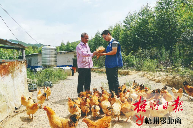 6月23日,在岑溪市安平鎮(zhèn)中慶村,駐村第一書(shū)記黎德路(右)在了解貧困戶(hù)廖木森家養(yǎng)殖的古典三黃雞的生長(zhǎng)情況,及時(shí)幫助他解決實(shí)際困難。 吳家寧 攝