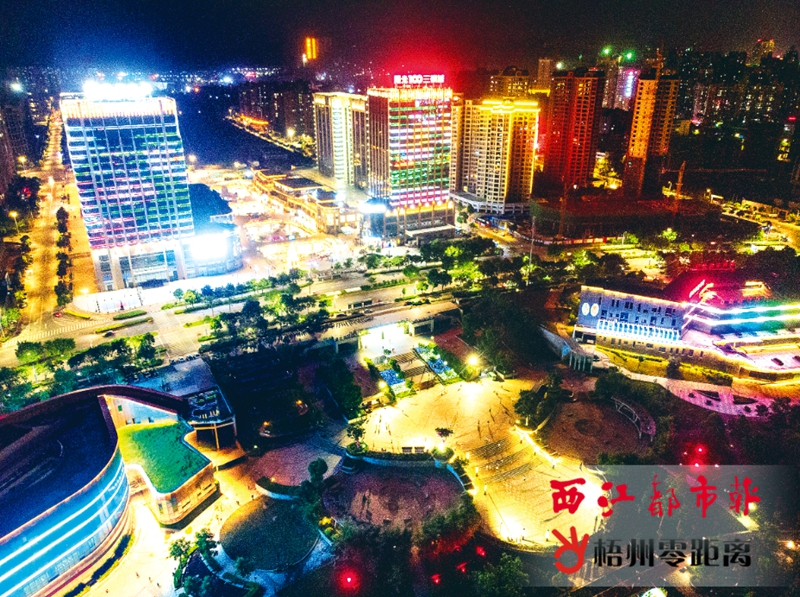 7月3日晚,玫瑰湖公園和三祺城的霓虹燈連成一片,點亮了夜間的紅嶺片區。