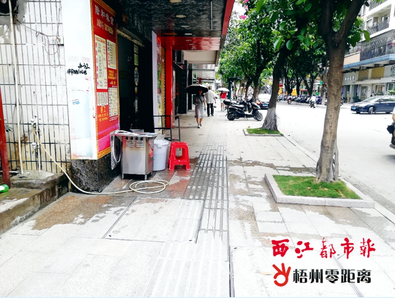 近15時,吉祥路一家餐飲店占道清洗用具,并將污水排放到人行道上。朱元冬 攝