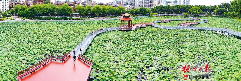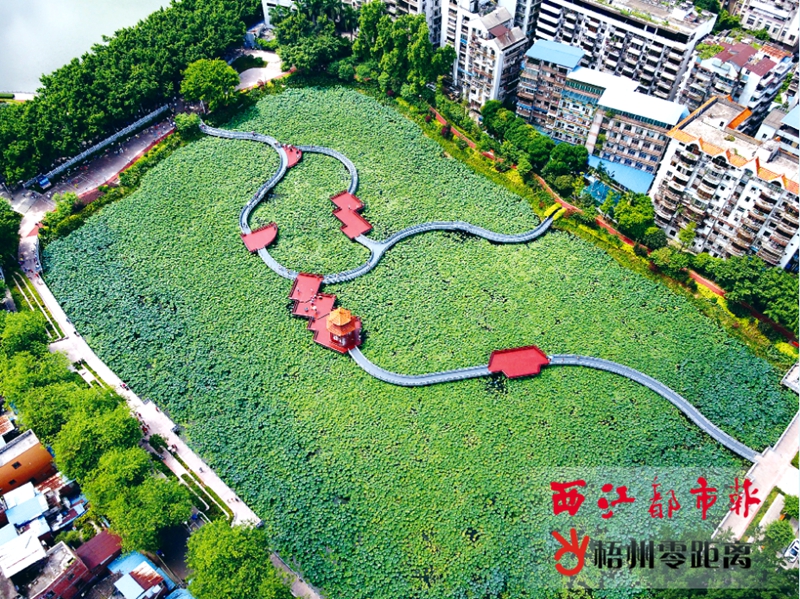 7月6日,在潘塘荷花池,碧綠的荷葉鋪滿池塘,整個池塘就像鑲嵌在城市中的一顆綠寶石。