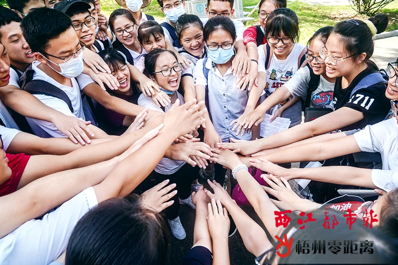 在梧州高中考點外,考生們一起加油鼓勁。記者 楊揚 攝