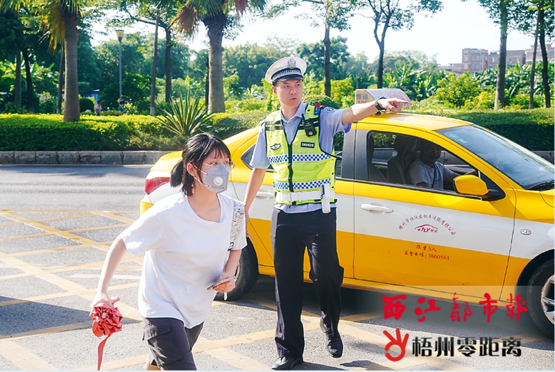 交警為遲來的考生指引進入考場的方向。本版攝影:記者 楊揚 在藤縣考區,也有兩名考生在準備進入考點時忽然發現身份證遺失了,在向民警求助后,藤縣公安局戶政中隊立即啟動考前應急預案,為考生開通服務高考綠色通道,僅用20分鐘時間就為兩名考生辦理了臨時身份證,讓他們能及時進場參加考試。 |