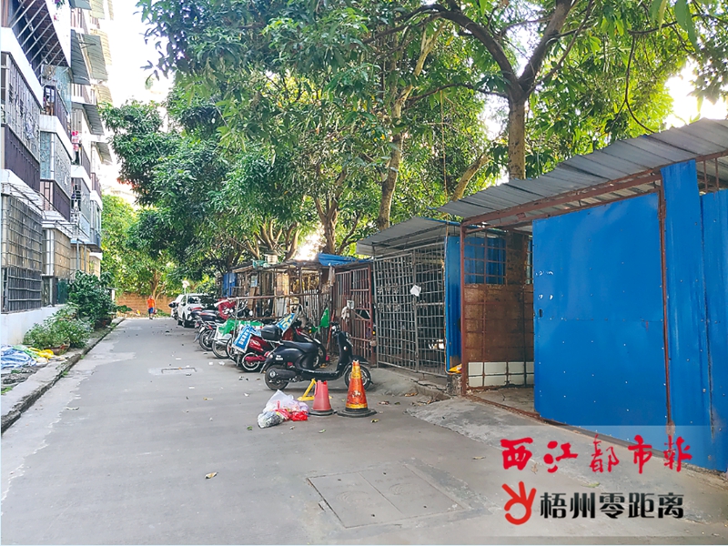 7月8日9時許,兩輪車和生活雜物在萬秀區金龍巷內隨意放置,占用了通道空間。何鎏 攝 在長洲區人口較為密集的居民小區周邊,小區大門出入口路面未按要求設置消防車輛通道禁停標線及路面警示標志,消火栓及消防水管周邊區域被車輛占據或被雜物堆積圍擋的現象較常見。新興二路匯客苑小區大門對開5米的區域,不僅沒有標注專門的消防禁停標線,還被附近商家在地上安裝了長長一串三角地鎖。匯客苑小區2號、3號、5號及6號樓樓下,均存在消防通道不同程度被占用的情況。該小區5號、6號樓對開的空地,原本是較為寬敞的消防通道,但被人用一個個鐵皮屋霸占,用于堆放雜物及停放兩輪車。一些樓房拐角的消防通道,則被居民安裝鐵欄桿圍起來,變成自己的“私家院子”。在紅嶺路海駿達小區,地下停車場及小區外圍臨街商鋪,消火栓周圍被劃為停車區域,消火栓的箱子被人為破壞。同時,還存在消防設施破舊、缺乏維護的情況。