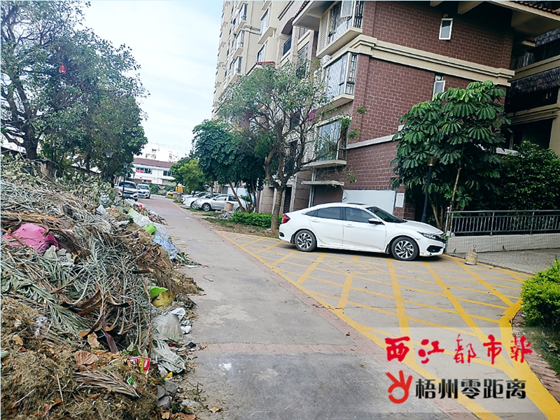 7月8日9時許,龍圩時代花園城內,消防通道兩旁垃圾堆積、雜草叢生,還有車輛在此亂停放。紀榮蘭 攝