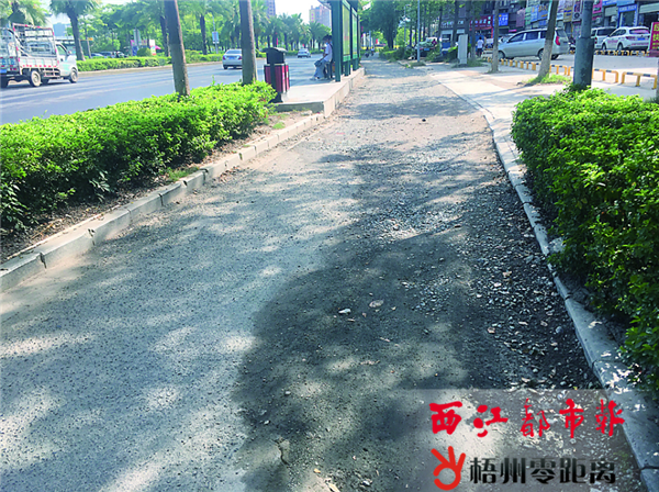 11日8時許,在長洲區紅嶺路的紅嶺新興路口公交車站旁,兩輪車道上布滿砂石,路面凹凸不平。