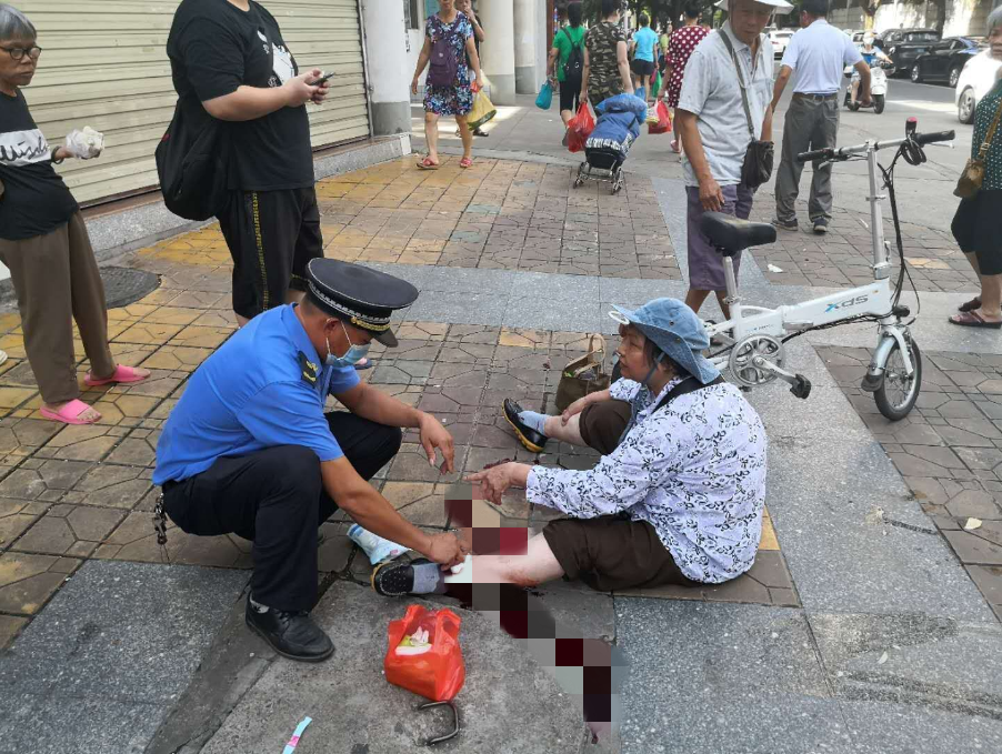 6月21日上午,長洲區城市管理執法大隊一中隊隊員在大塘市場周邊巡查時,發現恒祥花苑小區對面人行道上有一名老人摔倒在地,傷者黃玉英左腳腳踝處血流不止,旁邊停著一輛電動車。執法隊員劉建新見狀,快步走上前,先挪放好電動車,接著檢查黃玉英的受傷情況,另一名執法隊員李光慧幫忙維持現場秩序,防止黃玉英再受二次傷害,并同時撥打120急救電話及聯系黃玉英的家屬。