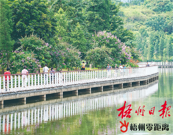 7月11日,市民行經(jīng)玫瑰湖畔東側(cè),沿線紫薇花盛開。