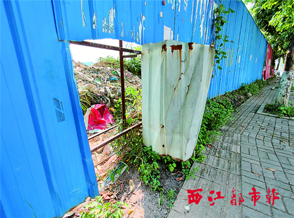 7月5日15時30分許,長紅小學(xué)對面人行道上的工地鐵皮圍擋被打開了一道口子,存在安全隱患。陳凡 攝