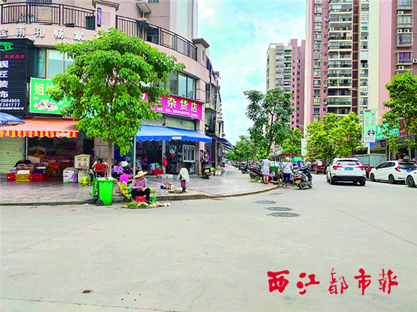 7月20日12時許,精通盛世花園A區(qū)周邊道路仍有個別攤販占道擺賣。蒙敏瑩 攝