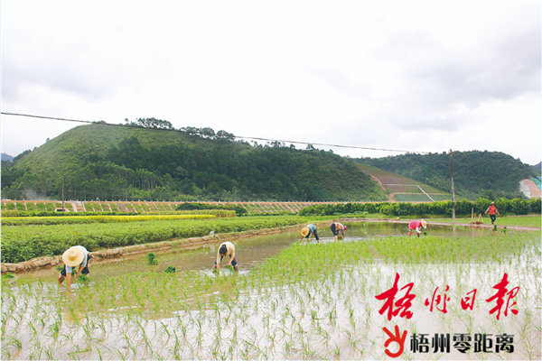 7月20日,蒙山縣西河鎮古排村農民抓緊時間開始搶插晚稻秧苗。