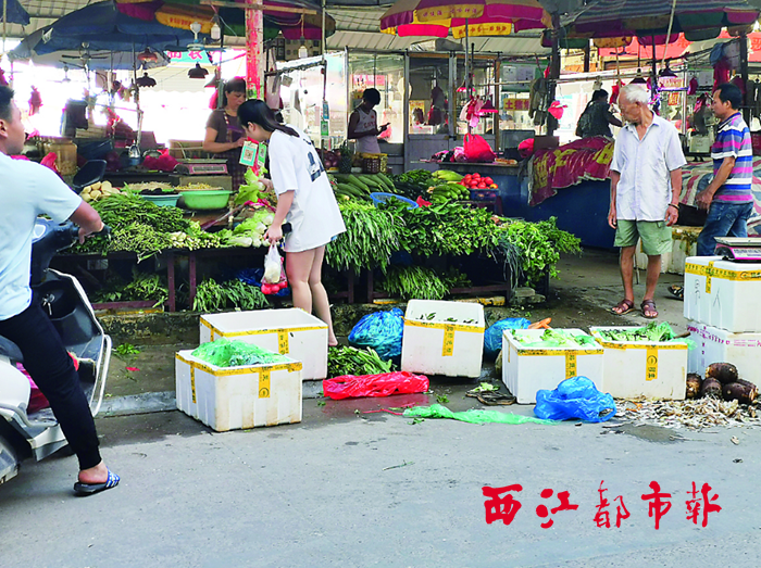 7月21日8時許,龍圩綜合批發市場內,攤販將待售蔬菜和垃圾隨意堆放路邊。紀榮蘭 攝