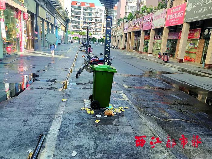7月21日8時許,南寧百貨周邊的道路上垃圾隨處可見、積水現象依然存在。紀榮蘭 攝