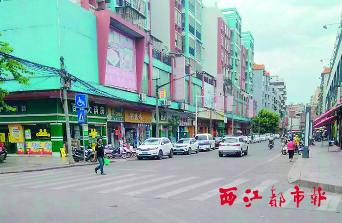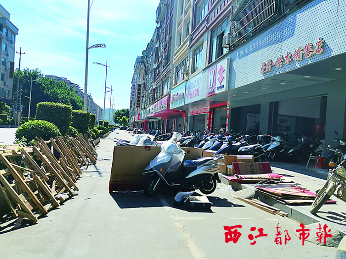 7月21日11時許,聚龍廣場周邊的占道經營現象有所改善。紀榮蘭 攝 此外,龍圩鎮政府附近路段車輛亂停、阻礙交通的情況得到了改善,但城南大道臨街商鋪占道經營及路面積水情況仍較為普遍。而且,由于相關部門正在對城南大道龍圩鎮政府路段此前被曝光的排水溝進行硬化施工,建筑材料堆積在路面,導致出現了新的影響市容現象。