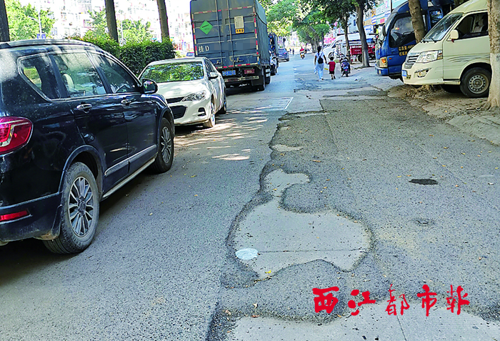 7月21日9時許,西南大道兩邊非機動車道坑洼破損,車輛亂停放情況嚴重。紀榮蘭 攝