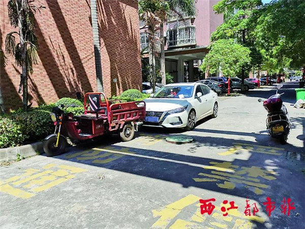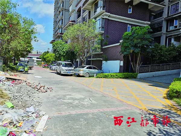 7月22日12時許,龍圩時代花園城內(nèi),車輛停放在消防通道,兩旁垃圾堆積。紀榮蘭 攝 |
