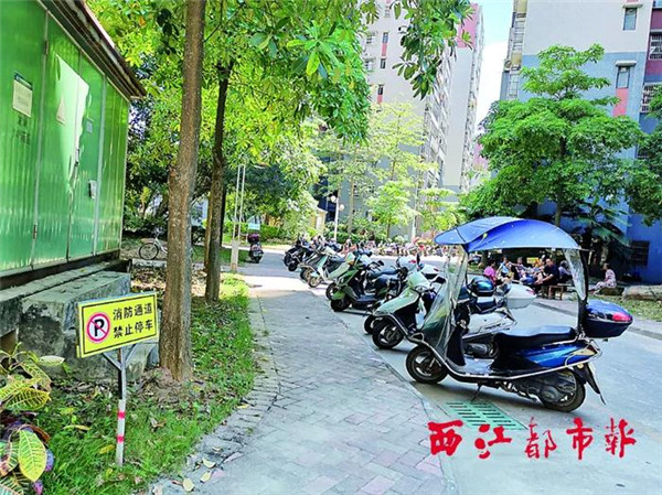 7月22日12時許,龍圩區(qū)龍湖春天小區(qū)13幢居民樓旁消防通道有車輛亂停放。紀榮蘭 攝
