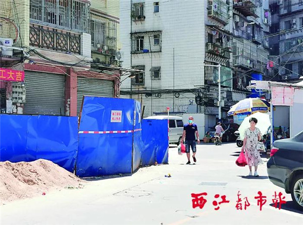7月8日8時42分,太陽廣場停車場東側(cè)入口被擋板和建筑材料阻隔。何鎏 攝