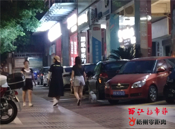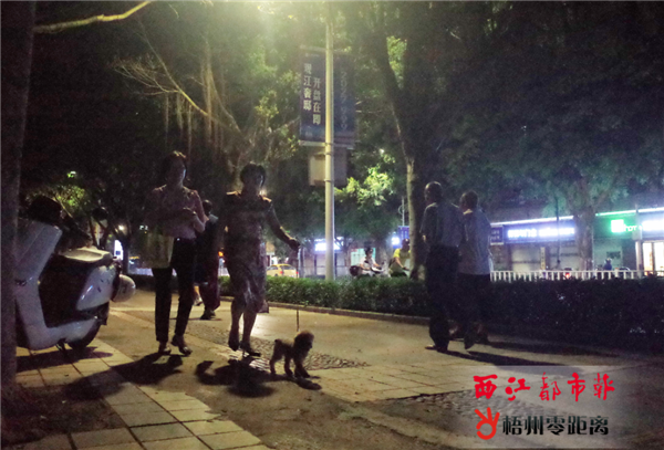 7月29日19時許,長洲區(qū)西堤路菊湖路口,有市民帶著寵物狗散步。 冼振宇 攝 根據(jù)《廣西壯族自治區(qū)文明行為促進(jìn)條例》的相關(guān)規(guī)定,城市重點區(qū)域禁止遛狗,萬秀區(qū)為白云山公園、防洪堤西堤路萬秀段等區(qū)域地段;長洲區(qū)為市政廣場、玫瑰湖公園、西堤路長洲段等區(qū)域地段;龍圩區(qū)為世紀(jì)廣場、蒼海湖公園等區(qū)域地段。在7月28日、29日晚上6時許至9時,記者沿新興二路、冬湖路、市政廣場周邊至西堤路沿途走訪發(fā)現(xiàn),在戶外遛狗的市民大多已經(jīng)給愛犬戴上束犬繩,然而在禁止遛狗的重點區(qū)域,仍可看到比較多市民在此遛狗。在西堤三路西江汊河橋底,兩位市民帶著一只黑色寵物狗在草地散步,小狗身上雖然有束犬繩,但主人并非時刻拿在手上。在西堤路喜來居廣場對開人行道,兩位市民用束犬繩拉著一只棕色的小狗散步。在西堤路菊湖路口,兩位女士帶著一只白色的小狗散步,盡管小狗有束犬繩,但過往的路人還是對小狗繞道而行。