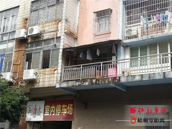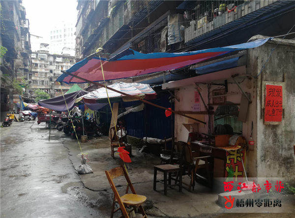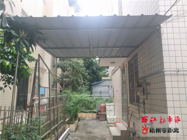 梧州零距離網-西江都市報訊 (記者 朱元冬) 住宅小區是市民群眾生活居住的港灣,然而,在梧州市內部分社區和農貿市場周邊的住宅樓亂搭亂建等現象卻屢禁不止。這些亂象既影響了城市面貌的整潔美觀,又非法占用了公共區域,影響其他居民群眾的生活和出行。 8月2日,記者走訪了萬秀區蝶山一路北面背街小巷里的居民小區,發現有一棟居民樓在一樓大門旁邊安裝了鐵門,鐵門上方的電線上還搭著幾塊鐵皮,其中一塊鐵皮向下彎曲,搖搖欲墜。該居民樓對面的空地上,幾個簡易帳篷一字排開,有些帳篷依靠幾根系著沙袋的繩子來固定,帳篷里則放置著桌椅。